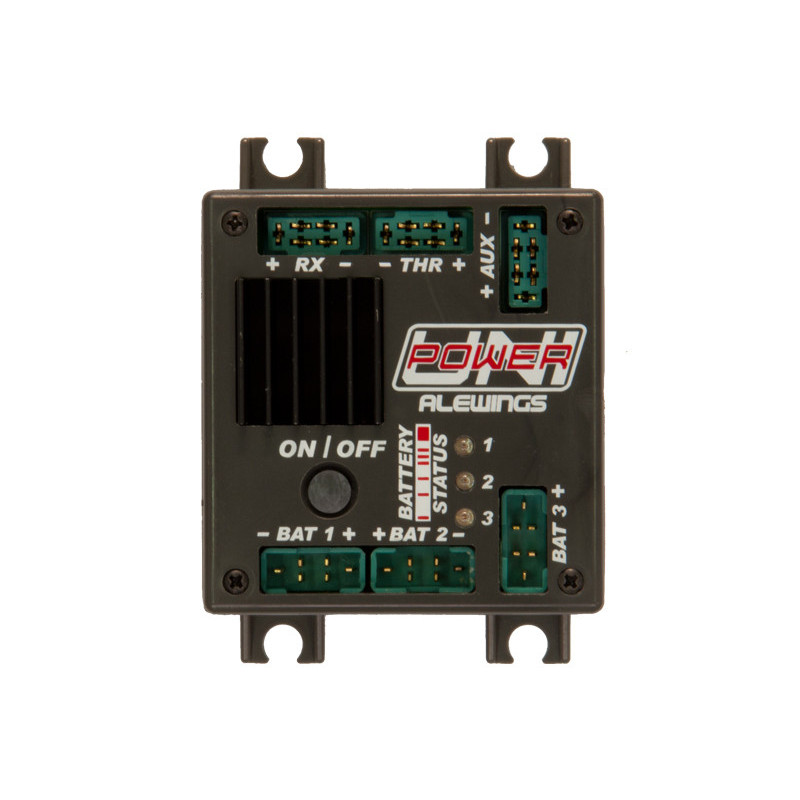 Les centrales d’alimentation de la série UniPower se caractérisent par un nouveau concept de sécurisation des installation de radiocommande. Dans moyens et grands modèles (jets ou voltigeurs) souvent on a la nécessité de gérer plusieurs batteries: normalement deux pour l’alimentation du récepteur et des servos, une pour l’allumage du moteur à essence ou de la turbine et autres, plus petites, dédiées aux fumigènes, trains rentrants, éclairages etc.. On arrive à un nombre de batteries compris entre 3 et 6, avec la redondance d’alimentation seulement pour récepteur et servos.UniPower3B révolutionne le concept d’alimentation et avec seulement trois batteries permet d'avoir tous les sorties nécessaires pour les dispositifs embarqués. Deux batteries (2S LiPo ou LiFe) sont dédiées à l'alimentation redondante de servos, récepteur et dispositifs auxiliaires (trains rentrants, éclairages ecc..). La troisième, 2S ou 3S LiPo, alimente seulement l'allumage du moteur à essence ou l'ECU de la turbine. Cela signifie que on a un'alimentation redondante tant pour les servos et le récepteur que pour les dispositifs embarqués. Dans le cas d'UniPower 3B l'allumage du moteur est clairement exclu. Cette version, en effet, est spécifique pour les cas où le voltage d'alimentation du moteur est différent de celui de servos, récepteurs et dispositifs ausiliaires. L'exemple le plus typique sont les turbines alimentées par une batterie 3S LiPo. Merci aux