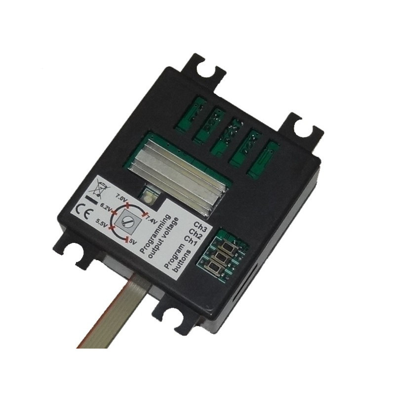 Elle est douée de filtres pour la suppression des interférences et de protection contre les courts-circuits pour chaque des 9 sorties des servos. Le système Servo Matching (pour les voies 1,2 et 3) permet de programmer le neutre, les fins des courses et la direction des servos correspondants. La programmation est facile grâce aux boutons à l’arrière du dispositif, mais pour la rendre plus rapide et aisée on peut acheter le programmeur externe optionnel, code 90010703.