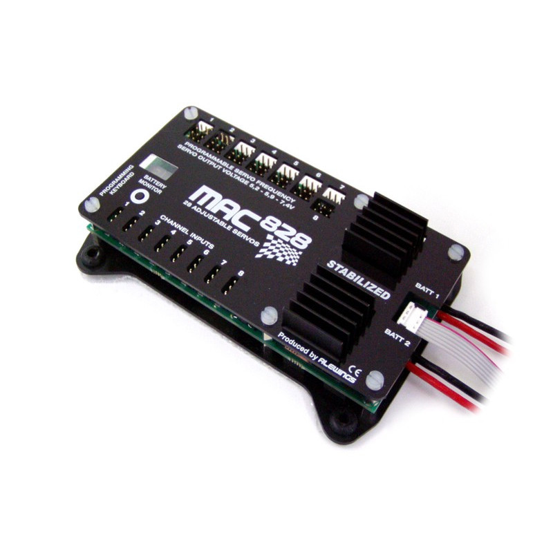 La MAC828 est une centrale d’alimentation et gestion des servos complètement programmable. Elle accepte en entrée deux batteries Lixx 2élts et huit voies de l’émetteur. Elle est équipée d’un interrupteur électronique double contrôlé par un bouton et d’un panneau externe avec double indicateur de l’état des batteries qui tient mémoire de la tension minimale. La tension réelle des batteries peut être affichée à l’écran. La tension fournie aux servos est stabilisée et peut être réglée à 5,2V, 6,1V ou 8V pour un courant de 36A en pointe. La tension au récepteur est stabilisée à 5V, 1,5A. La MAC828 est équipé de filtres pour la suppression des interférences et de protection contre les courts-circuits pour chaque des 28 sorties.6 voies présentent 4 sorties jumelées et 2 voies en présentent 2. Pour toutes les sorties on peut ajuster le neutre, les fins des courses et la direction. On peut sélectionner la fréquence de modulation pour l’utilisation avec servos analogiques et numériques.