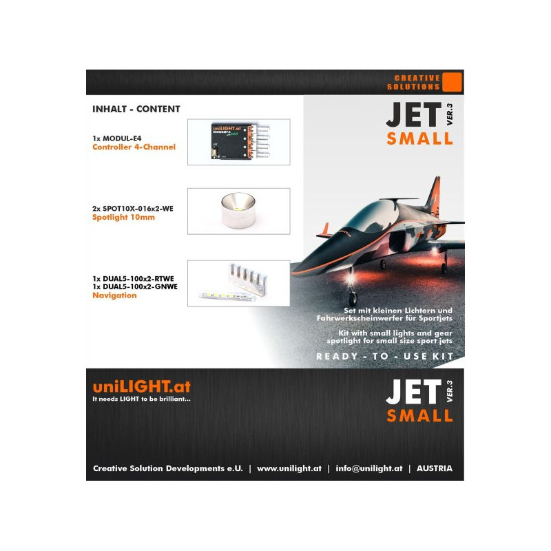 Kit d'éclairage professionnel pour jets sportifs et modèles à géométrie d'aile fine, tels que les turbopropulseurs. Un kit de démarrage compact et performant comprenant une radiocommande 4 voies, des feux de navigation rouges et verts, ainsi que deux petits projecteurs pour les jambes du train d'atterrissage.
