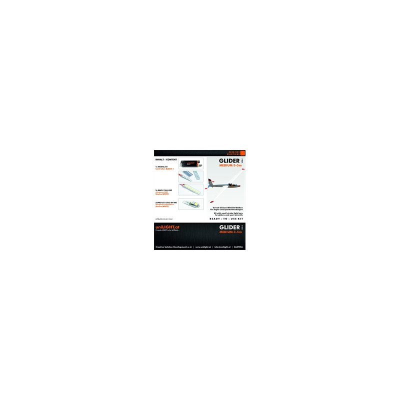 Kit d'éclairage professionnel avec les éclairages les plus performants pour votre planeur ! Ce kit comprend une unité de contrôle à 1 canal, des barres stroboscopiques de 5 mm et 2 feux stroboscopiques professionnels 8 V de 12 mm. Le système peut être complété par des éclairages supplémentaires.