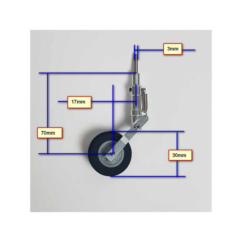 2 jambes pour train principal: hauteur totale avec la roue 70mm, pour CAP 3mm avec roue Ø 30mm