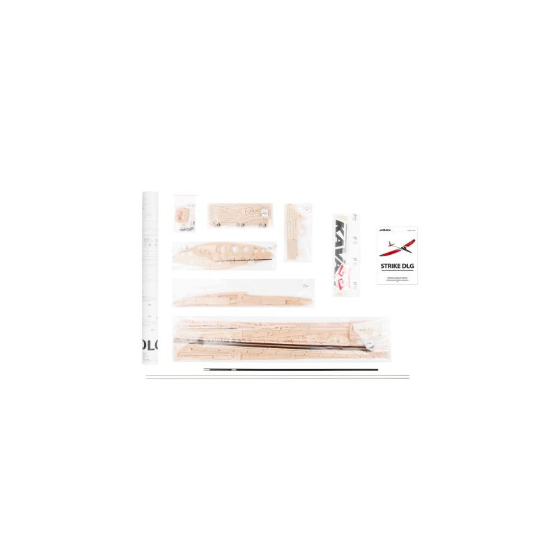 Le kit contient : des pièces en balsa et en contreplaqué découpées CNC, des tubes en carbone pour les longerons principaux, une poutre de queue en carbone, un ensemble d'accessoires, une planche d'autocollants, un plan de construction grandeur nature et un manuel d'instructions.